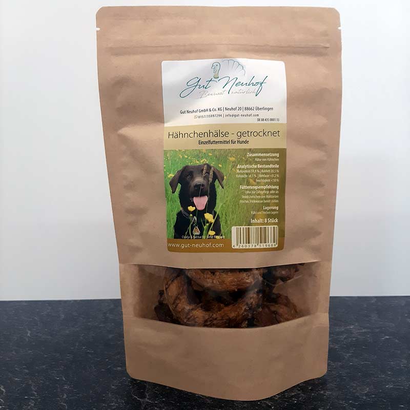 Probier es einfach aus und gönn Deinem Hund den leckeren Knabberspaß mit unseren Hähnchenhälsen getrocknet.