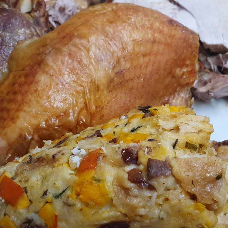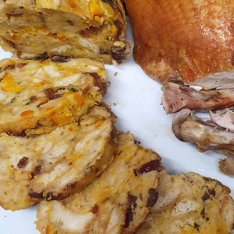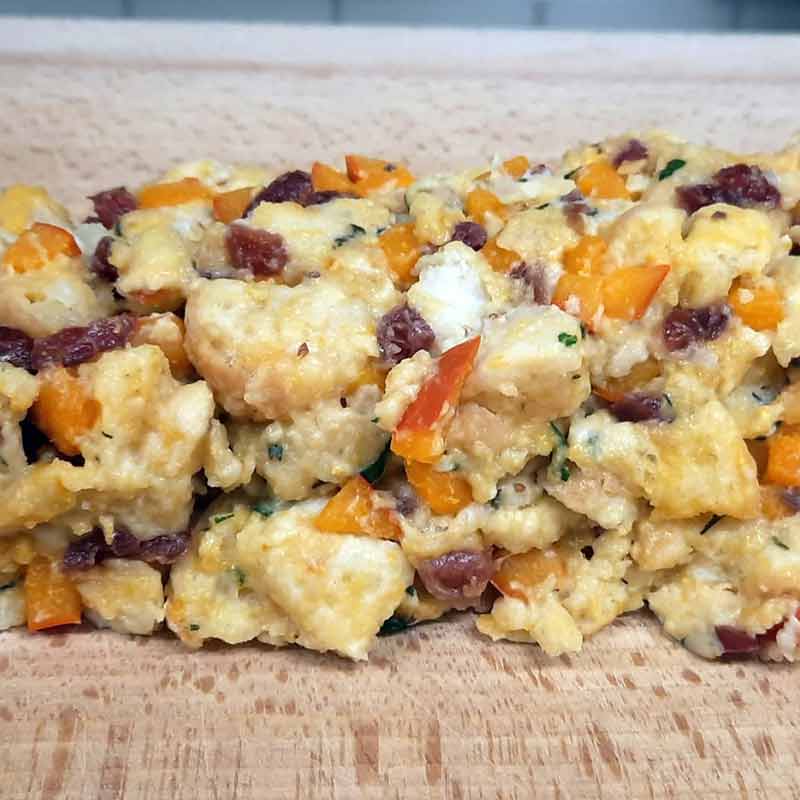 Unsere Kürbis-Semmel-Füllung ist sehr vielseitig: Du kannst sie direkt in Ihren Truthahn oder Ihre Pute füllen, aber auch andere Gerichte wie Knödel, Aufläufe oder Gemüsepfannen damit zubereiten. Dank der Gewürze schmeckt die Füllung aromatisch und würzig. Deine Gäste werden begeistert sein!